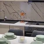 Er is een koelkast en een oven in een ingerichte keuken. Kompleksi bushalte bevindt zich vlak om de hoek van het appartement.